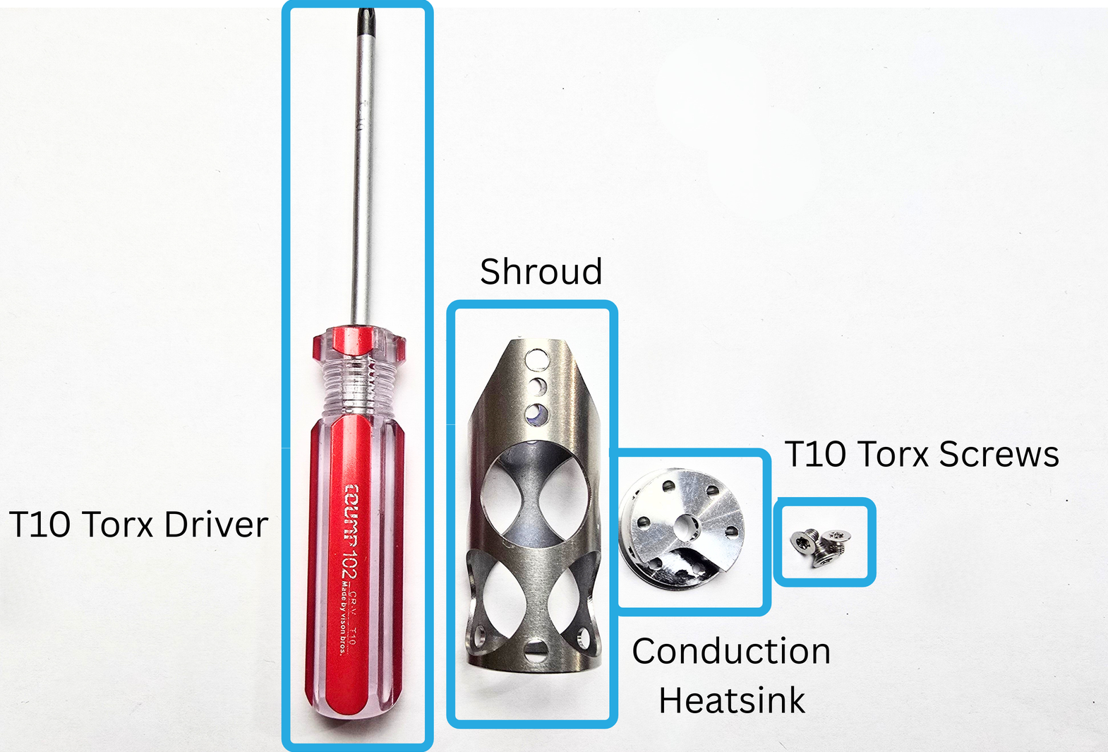 You will need a T10 Torx driver, a Chube Shroud, a Conduction Heatsink, and 3 T10 torx screws.