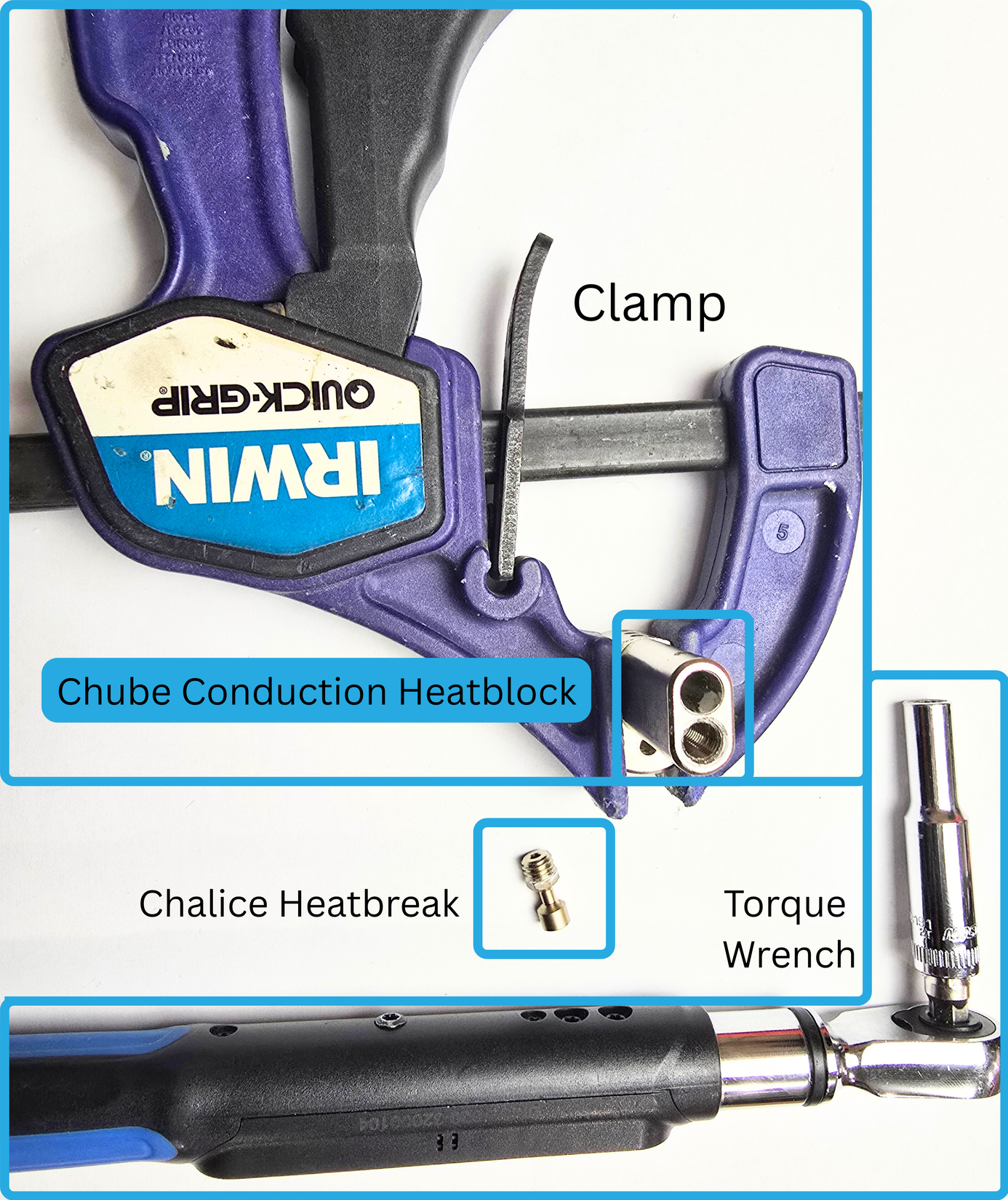 You will need your Torque Wrench, Chalice Heatbreak, a clamp, and the Chube Conduction Heatblock for this step.