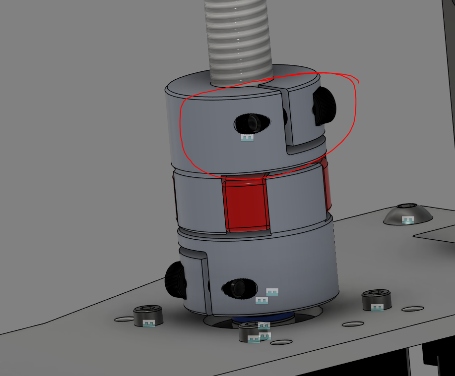 - Once the bed platform is moved away, lighten the tension on the upper Z screw coupler that connects the screw to the motor. This will likely cause the screw to fall down slightly, this is normal, as the coupler is holding the screw up slightly to allow for slight displacement.